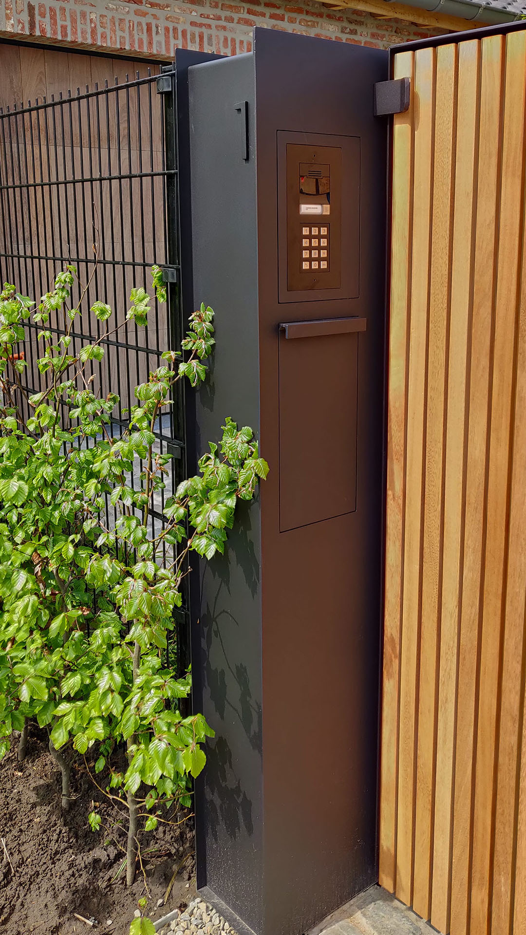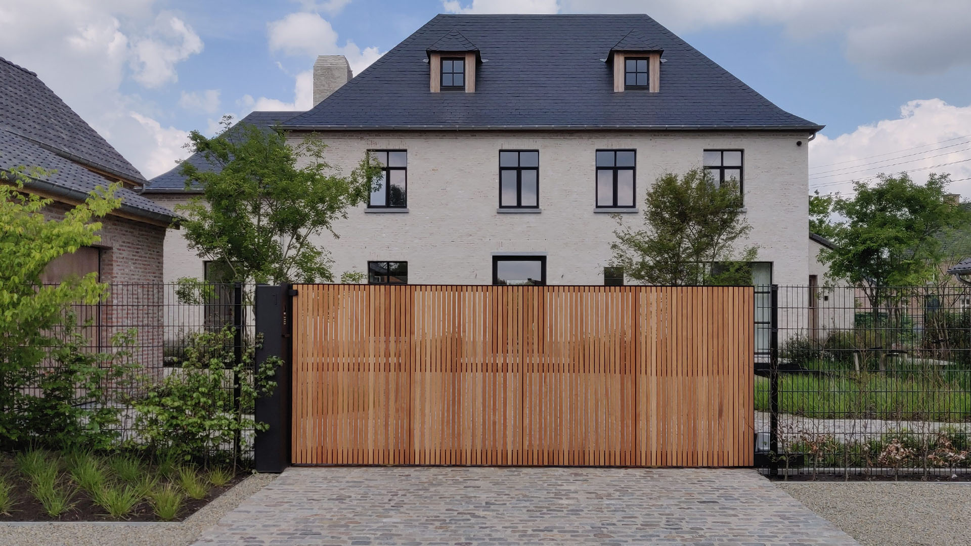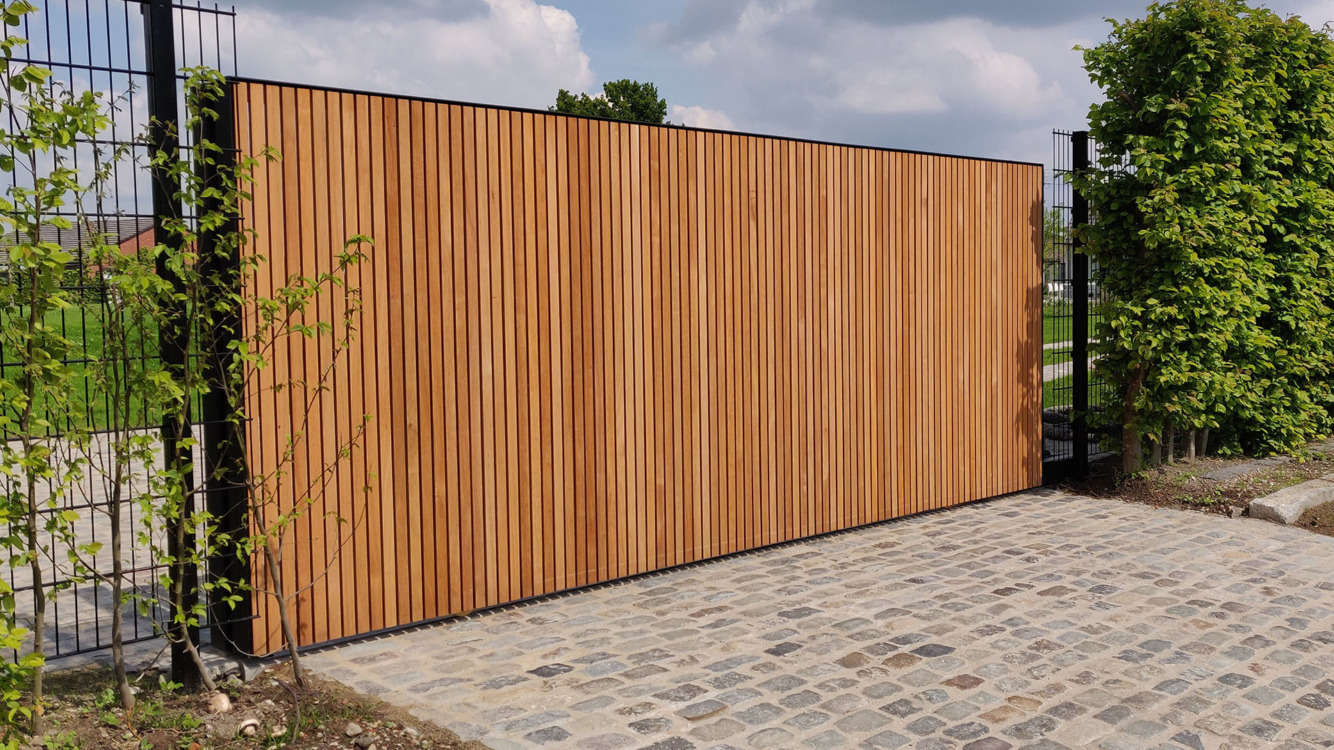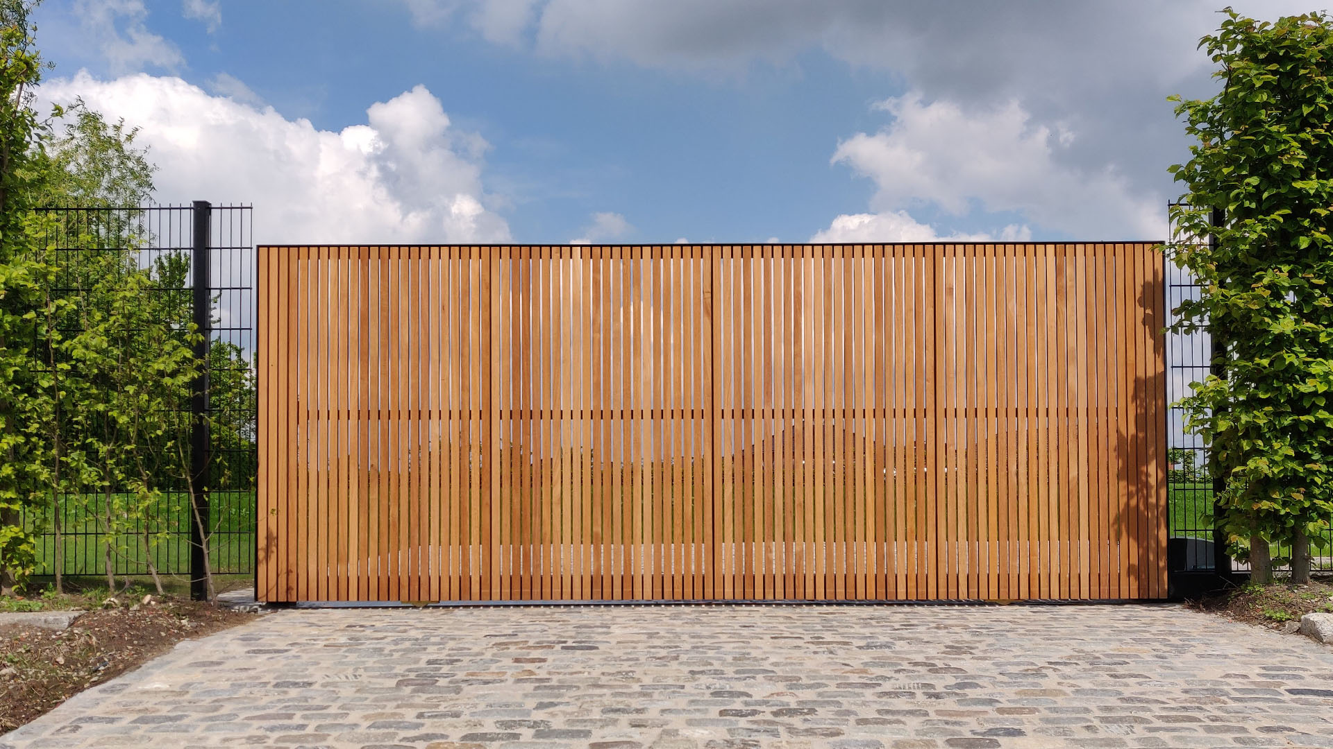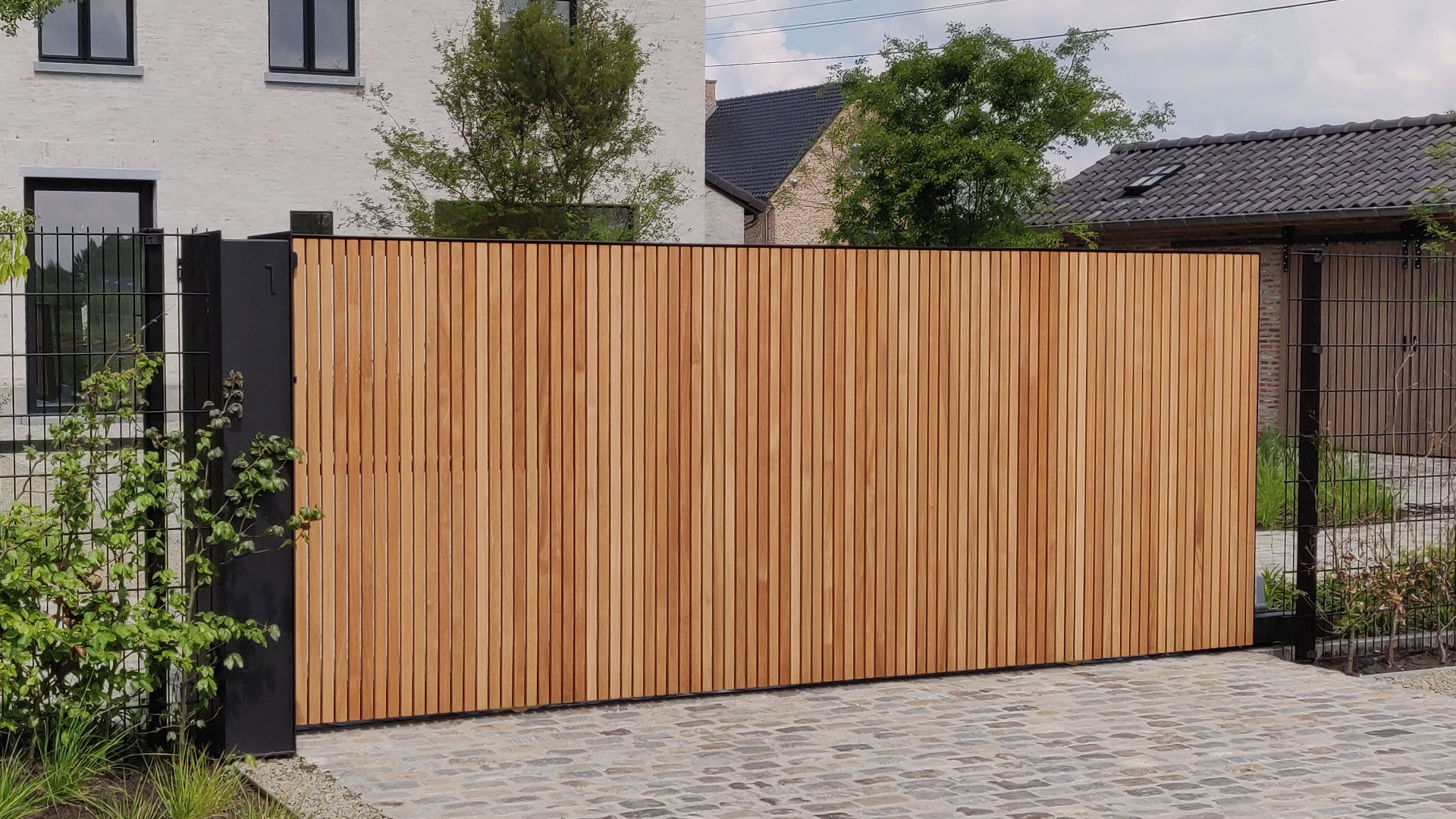 Design schuifpoort stalen kader met Afzelia bekleding - Sint-Lambrechts-Herk